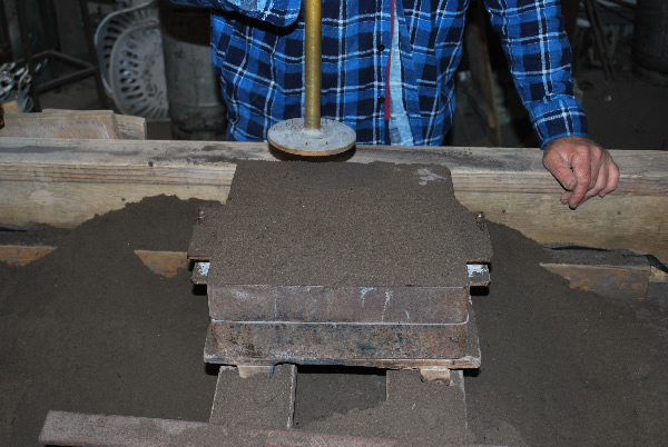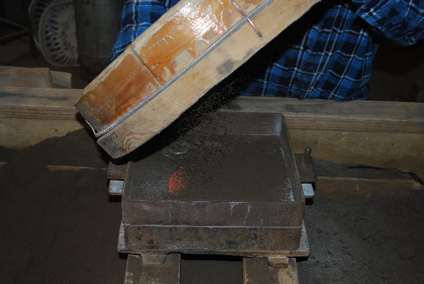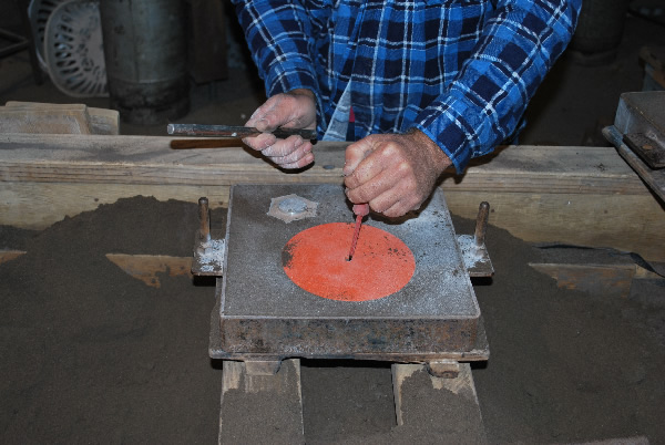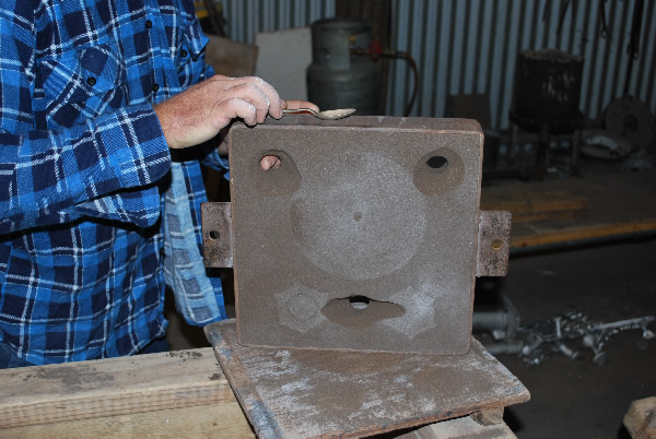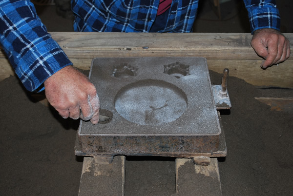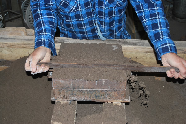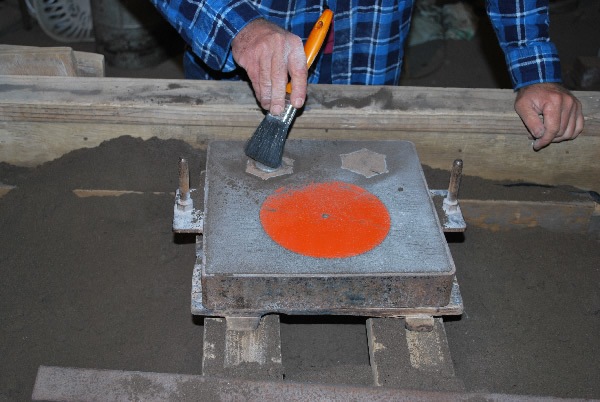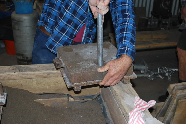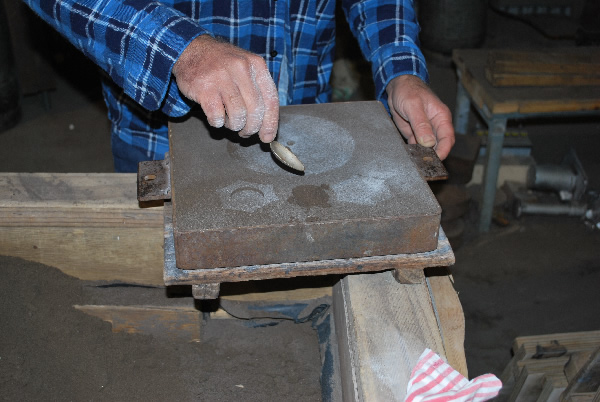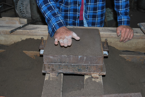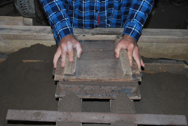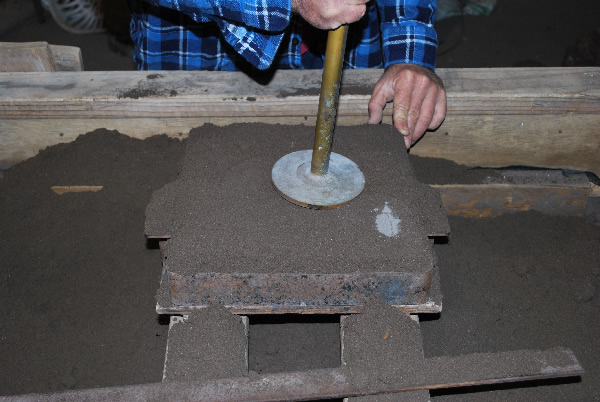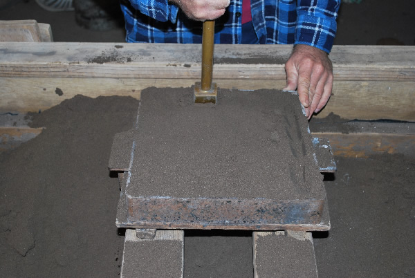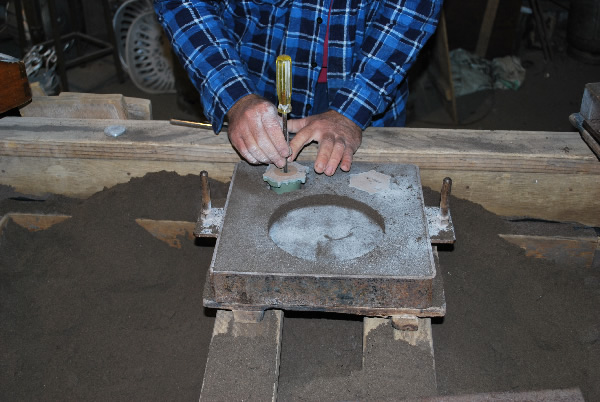 Fingering the holes to avoid grains of sand washing into the mould when pouring.