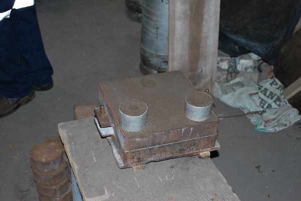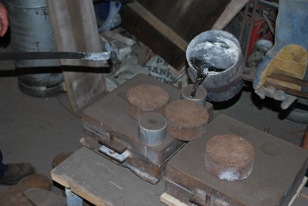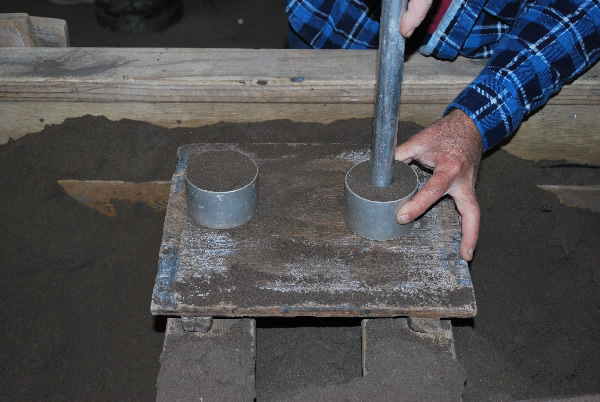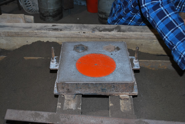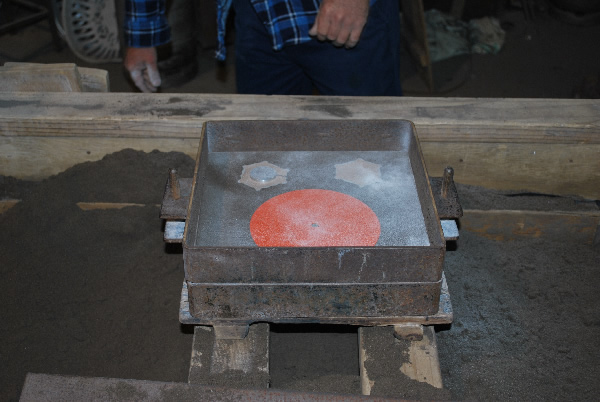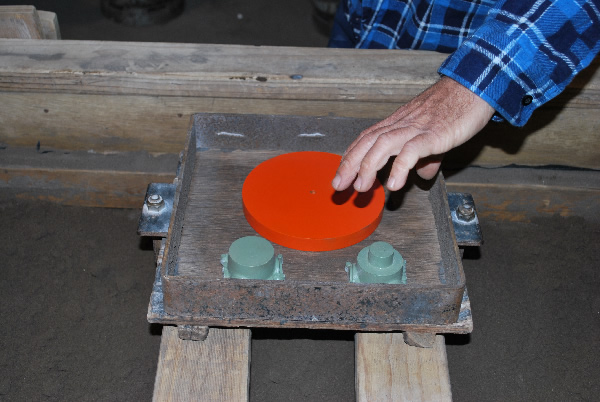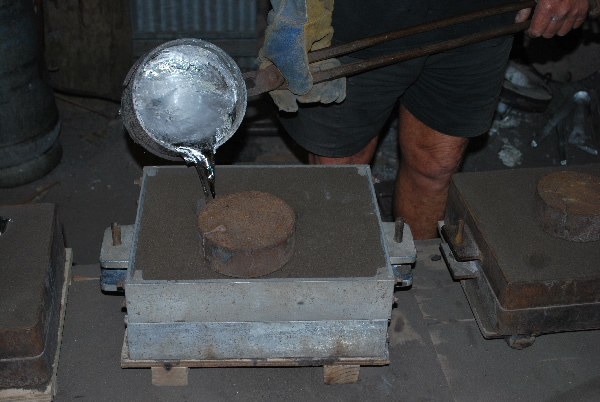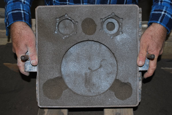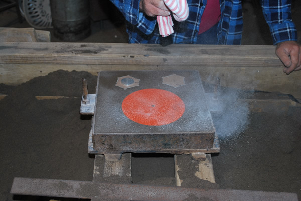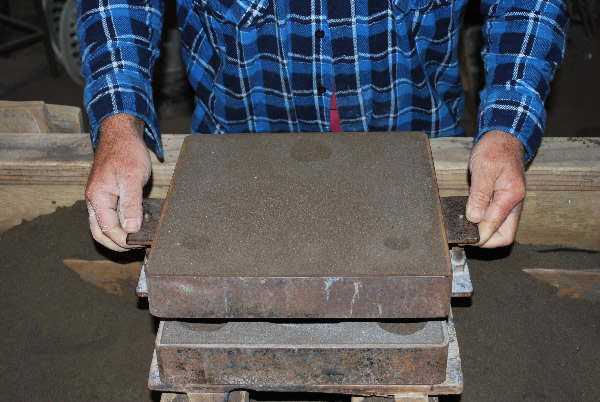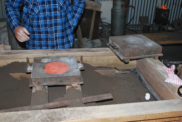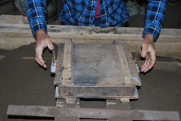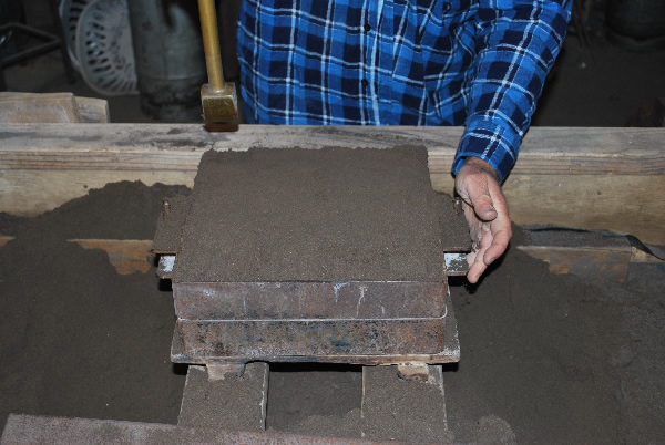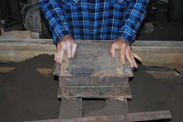 Fingering the holes to avoid grains of sand washing into the mould when pouring.