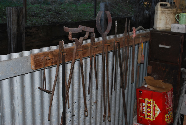 Standard furnace tools including skimmer, tongs for lifting and pouring, long handle pliers, tongs for handling metal when adding to the pot.